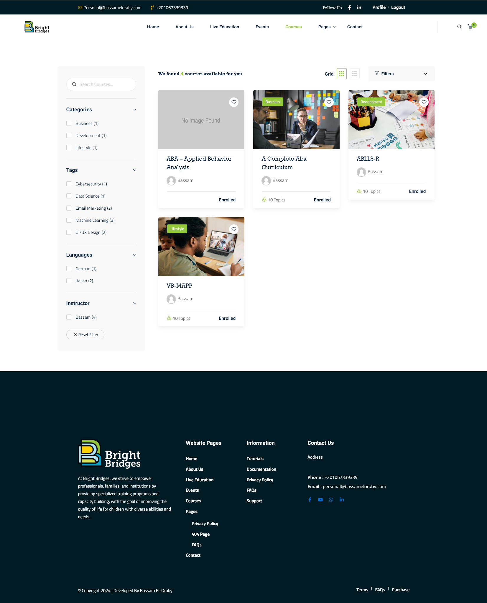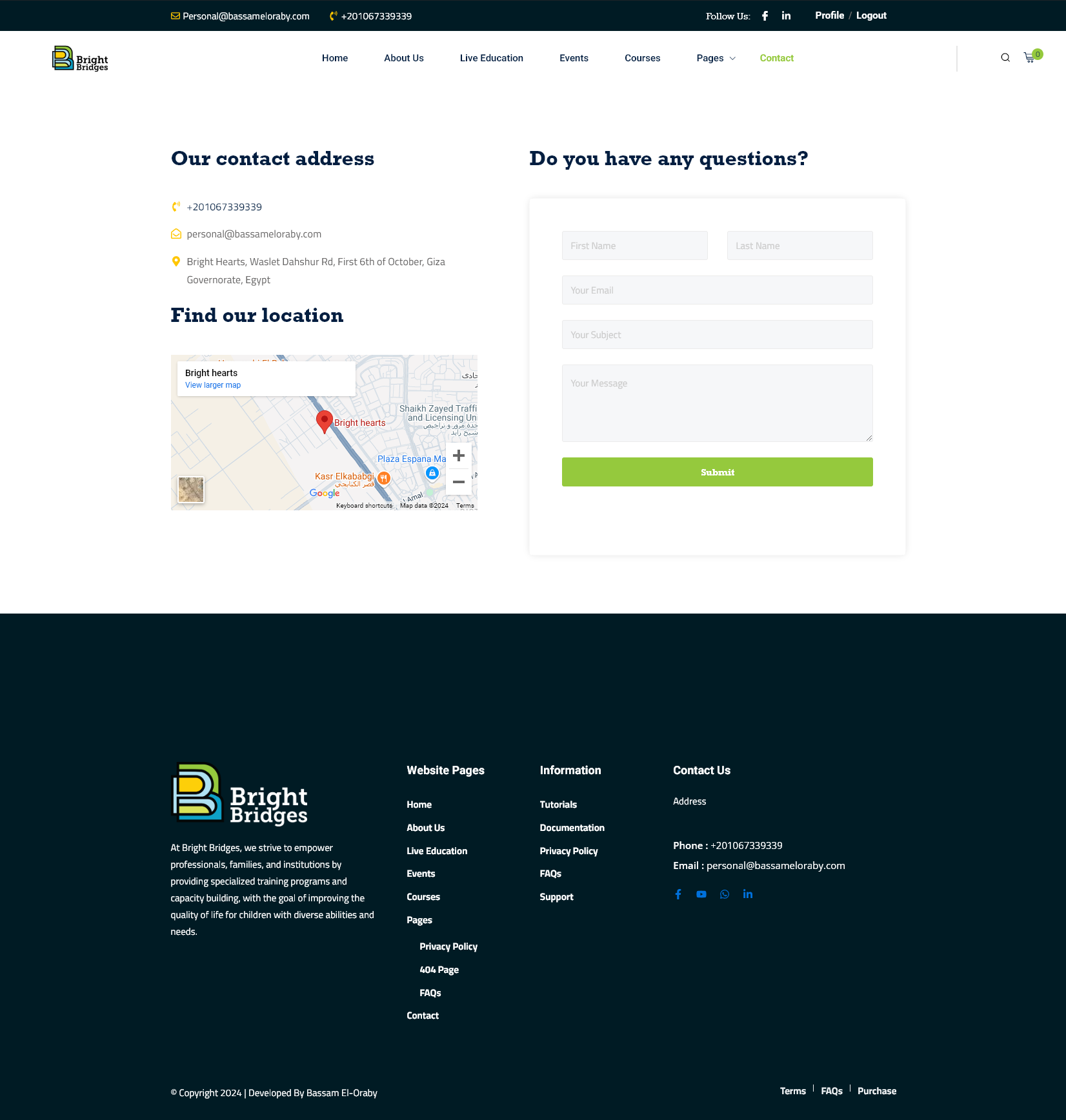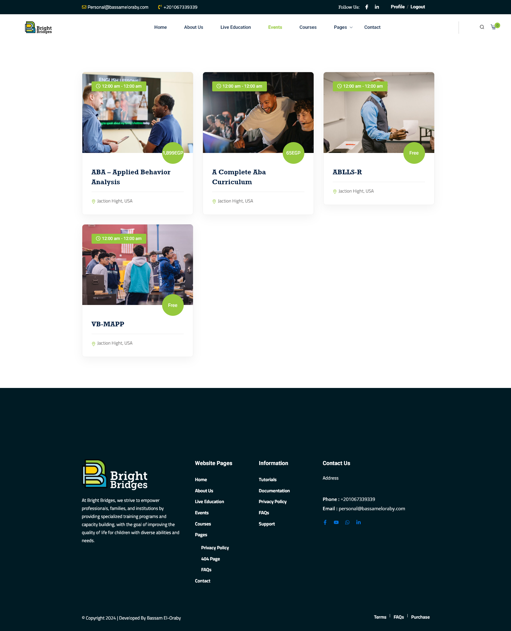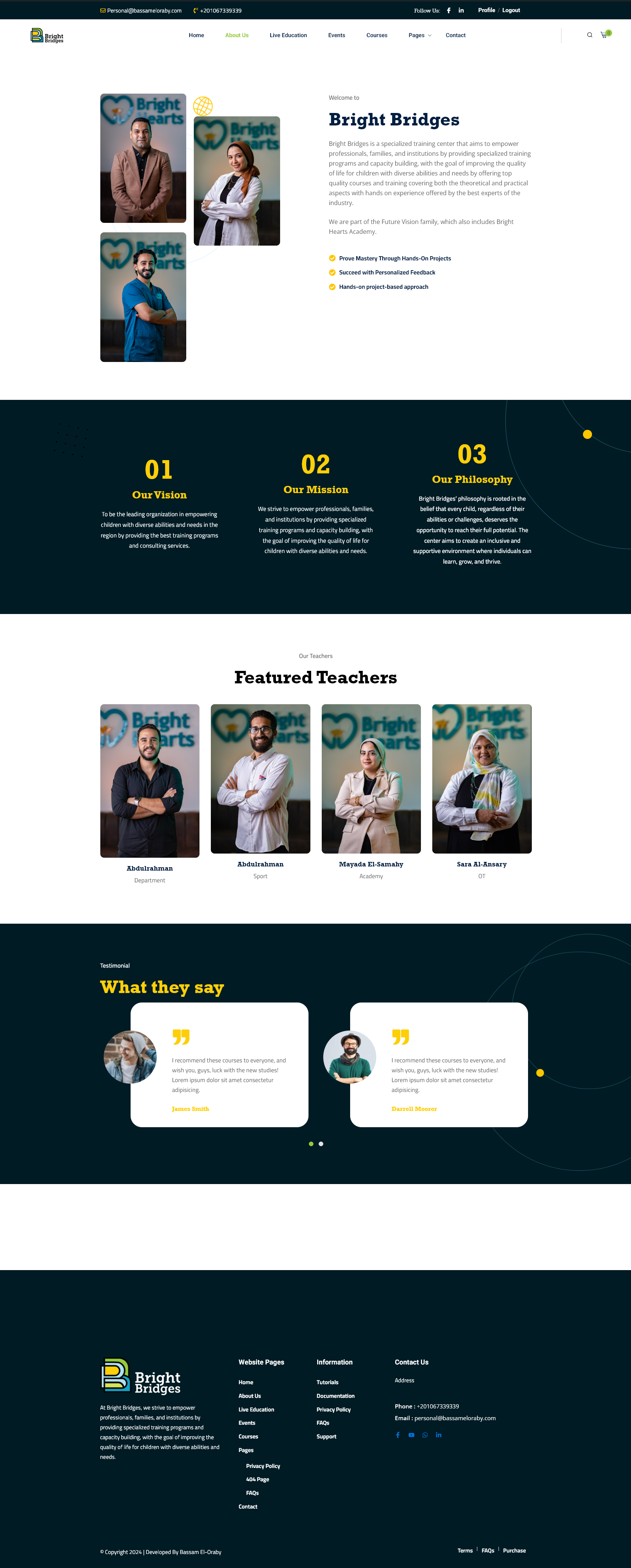 Bright Bridges Academy is a Daughter company of ‘Future Vision’, this academy is dedicated to training and qualifying professionals in the field of special education. Its mission is to transform the landscape of special education and disability care, not only in Egypt but across the Arab world. By providing a centralized platform for specialized training, the academy aims to elevate the skills of professionals, meeting their educational needs and facilitating the practical application of their knowledge. Under the guidance of our expert team, learners can benefit from a structured learning approach and ongoing practical training.”